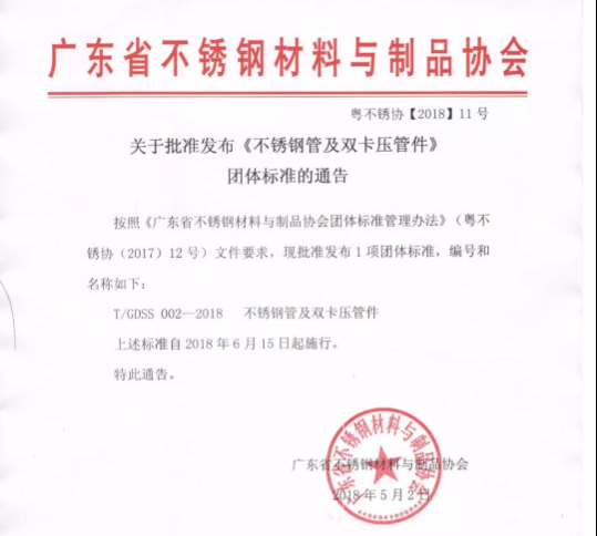 佛山大銘管業參與起草《不銹鋼管及雙卡壓管件》團體標準6月15日起執行