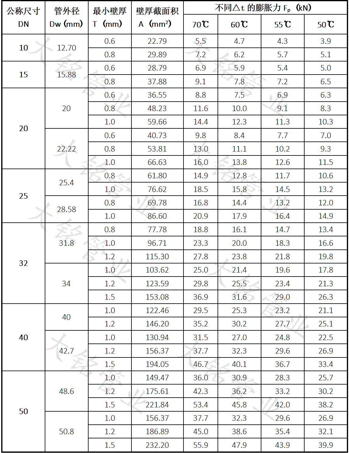 當采用固定支架限制管道變形時,江蘇衛生級不銹鋼熱水管道的固定支架應按其支撐力大于因溫度變化引起的膨脹力設置。管道膨脹力按下式計算,具體見表: