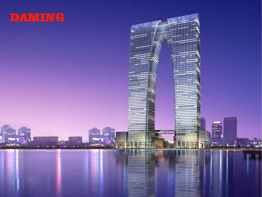 東方之門,,總高度為301.8米,其幕墻規格近百種共需16萬立方米,平鋪占地面積約有15個標準足球場大,該工程預計2014年年底整體完工。